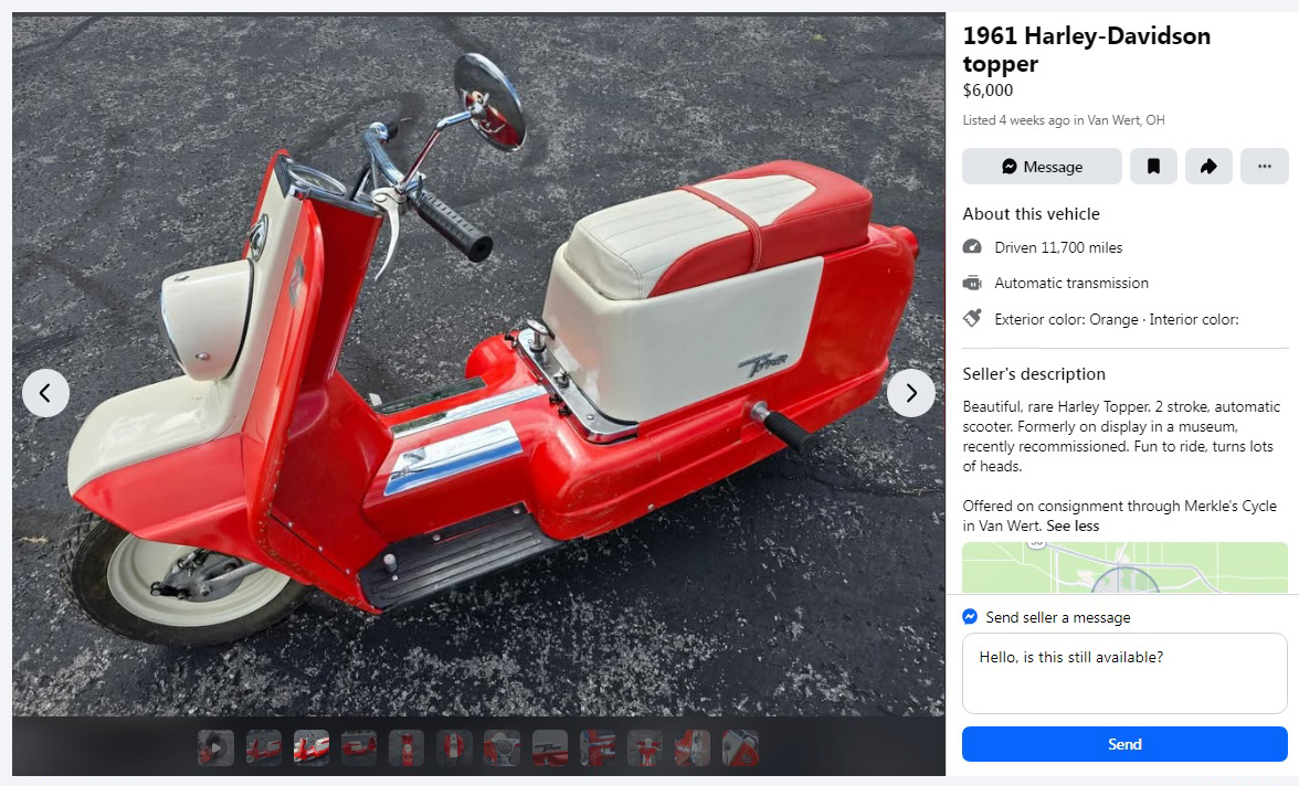 We’ve seen Harley’s unique scooter, the Topper, nine times here on Barn Finds over the years, and oddly enough, I wrote up eight of those, plus this one. You could say that I’m a fan, even though I’ve never owned one. Yet. We all know that this isn’t a motorcycle that you’d take on the freeway, and yes, if you get hit by a Chevy Suburban, you won’t have to worry about too much after that.