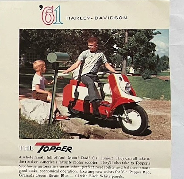 I just wanted to get those things out of the way, as they almost always come up on posts showing small vehicles or motorcycles. Between 1960 and 1965, big, bruiser bike-builder Harley-Davidson offered the Topper, a kinder, gentler ride for some of its customers. Made of steel and fiberglass – the Topper, not the customers – these tiny tot two-wheelers are always interesting to see, and to think about the era when they were available. The Wild One hit the big screen almost a full decade previously, but the public still looked sideways at motorcyclists, in general.