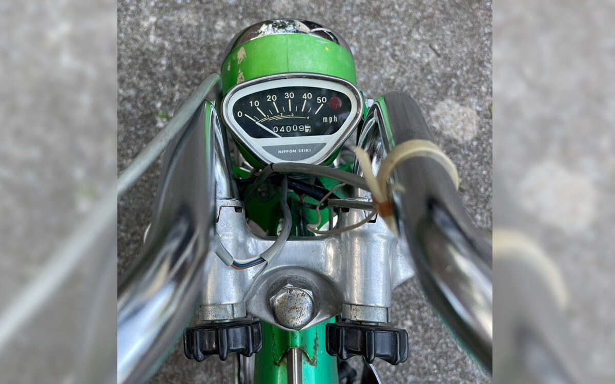 The 1970 CT70H came in Candy Blue Green, Candy Topaz Orange, and Candy Emerald Green as seen here. This one has 4,009 miles and the seller says it’s an unrestored original example other than having a reproduction seat. It has a few nicks and scratches as expected, but it looks better than if I would have owned this as a kid. You can see the knobs for loosening the handlebars so they could be folded down and this bike could be lifted into the giant trunk of a 1970s car.