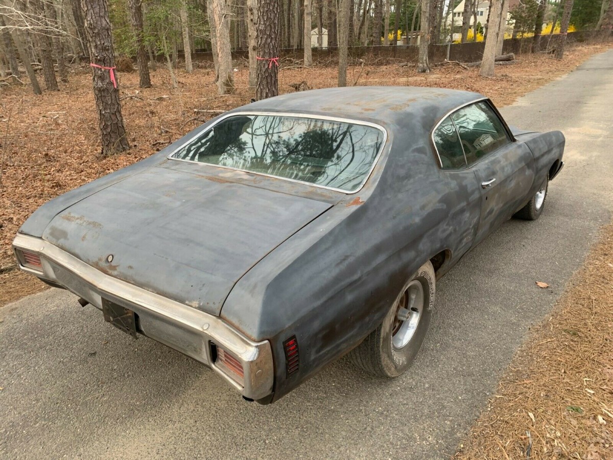 The heart of this beast is the L34 396 cubic inch V8 engine backed by a Muncie M20 4 speed transmission. The factory build sheet indicates that the rear gears are 3.31. The engine is said to have lifter noise and will most likely need to be rebuilt along with the rest of the car. The car is in primer and there is a lot of surface rust but the only rot appears to be in the passenger side floor and trunk. The buyer has a new trunk pan that he bought that goes with the sale.