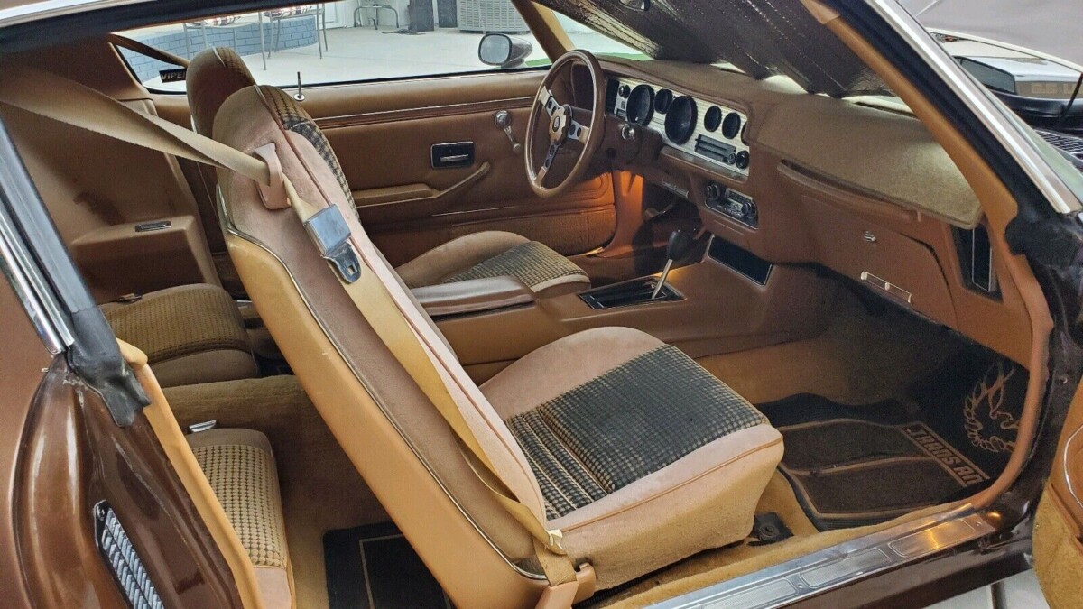 The interior indicates that this Trans Am is equipped with air conditioning and the deluxe interior option. The car does not have power windows or T-Tops. The tan hobnail bucket seats are worn but both Legend Interiors and PUI make the replacement covers. The dash is covered up so that means it is probably cracked if it has spent much time in the New Mexico sun and heat. Al Knoch Interiors will completely restore a dash like this to the correct color for about $800. I have had two dashes restored by them and they do a great job.