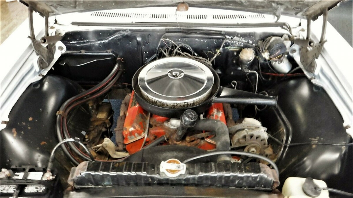 This is extremely original, as for the engine bay. See that strap/brace on the right side? That was an early GM recall for their really bad motor mounts. Several people were killed because the torque of the motor would shear off the mount and if the car was accelerated hard, the engine would torque, move over and the throttle linkage would jam at potentially high speed. When I was very young, I borrowed a friends’ 1964 Impala wagon and he warned me not to accelerate hard as his mounts were sheared. Of course I jumped in forgetting that warning until the fan started grinding against the metal shroud. Anyway, the fact that, that recall brace is still there on this car speaks volumes about the originality. When has anyone see one of those before? Nice car.