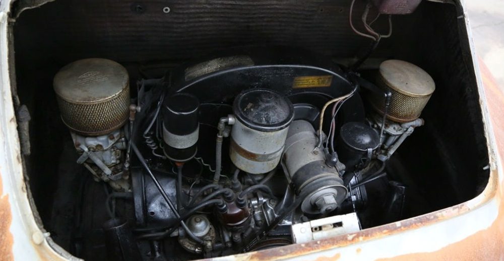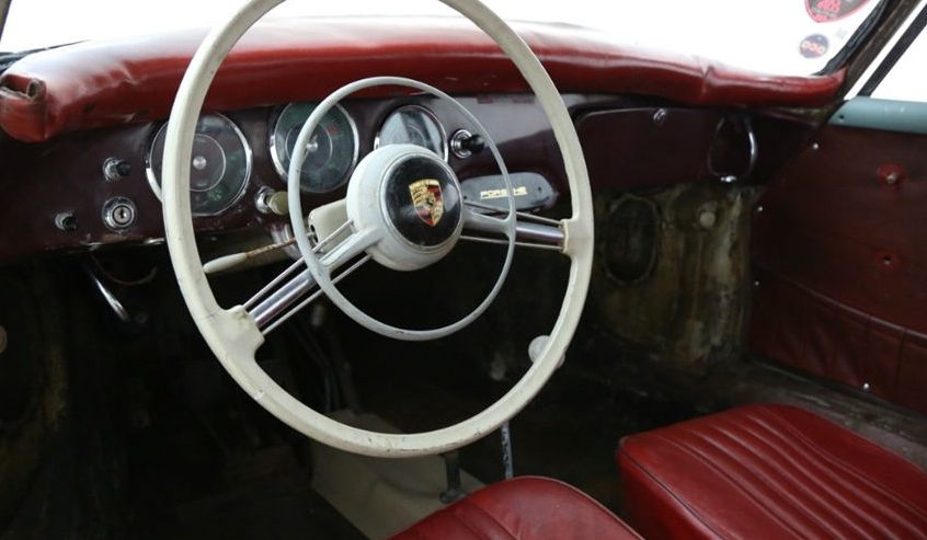 Inside, we’re treated to a very original-looking interior with gorgeous red leather seating surfaces and an attractive steering wheel with seemingly good cosmetics. The “A” series 356s of this style were known as “T-2”-body cars, which is discernible by a few visual clues out back: first, the taillamps changed to teardrop-style designs; the license plate lights now shone upwards; and the exhaust tips exited via cut-outs in the rear bumper. Small tweaks for sure, but an important detail if you’re hunting for a specific bodystyle of an earlier model 356.