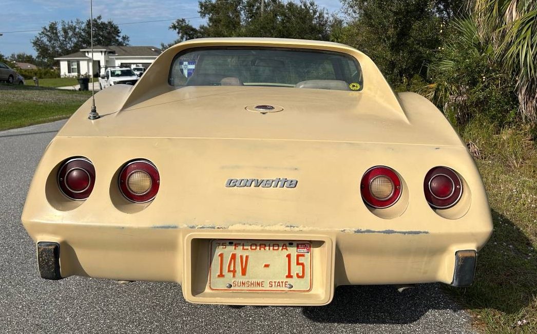 The aforementioned mid-seventies Corvette features did nothing to harm sales as ’76 set a record with 46K copies hitting the street. All were coupes as the convertible had been dropped in ’75. The seller tells us that this example is “untouched and completely stock“. This car is finished in “Buckskin” which was a decidedly unpopular color and had the second-lowest production number in our bicentennial year with just 2,954 takers. This car wears it well but the seller suggests, “The car needs paint w/ minor bodywork“.