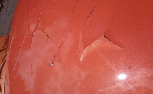 Fifteen years are said to have passed since this Pontiac received a restoration, and not too many details are provided about what sort of bodywork was done before the custom paint was applied a decade and a half ago. However, the car is claimed to be rust-free and have no dents, with the undercarriage stated as immaculate, so it sounds like the metal may be solid everywhere. The biggest issue outside is on the roof, as the finish is cracking where a vinyl top once resided. A suggestion from the seller is to put some new vinyl back up there, which seems like a much easier fix than starting from scratch on the entire body. What color material goes well with orange, silver, flames, and skulls?
