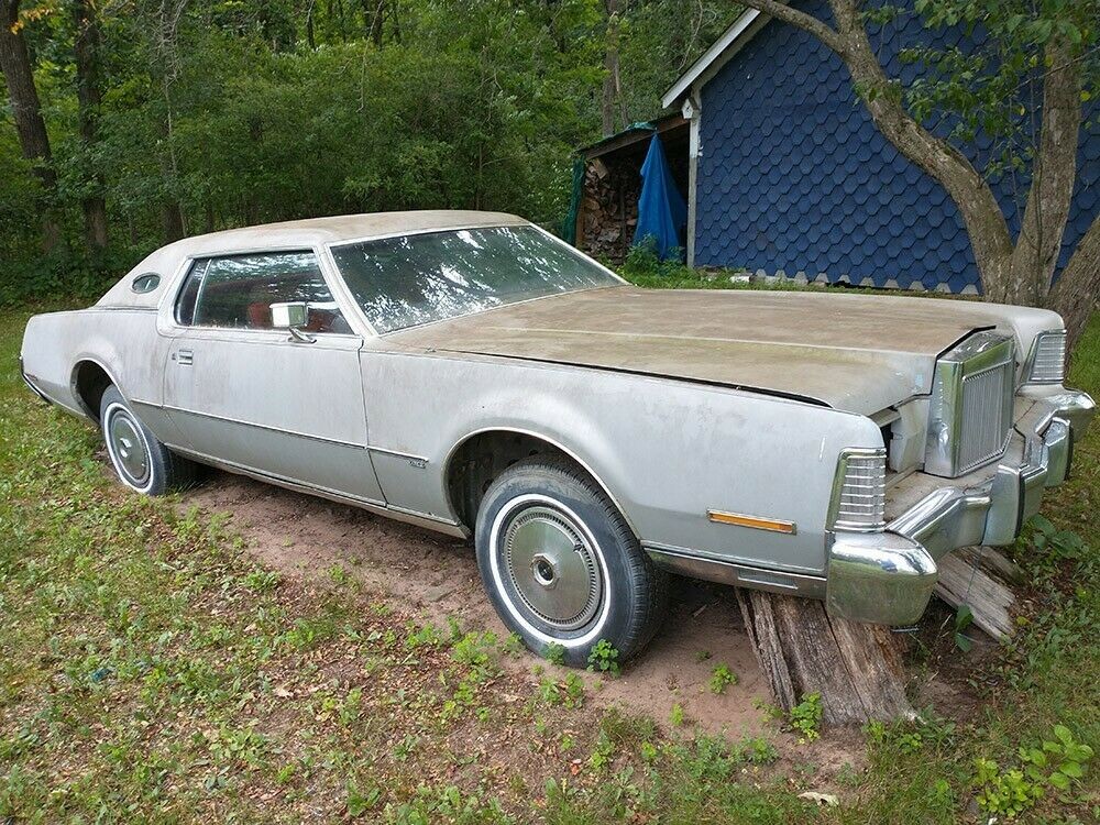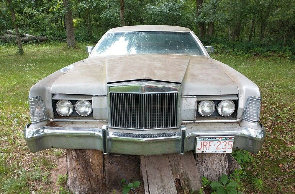 This car originated in Arizona and ended up in Wisconsin, as we’re told. As such, it was never driven during the winter months on salty roads, but that may have changed when it went north. As we so often hear, this Lincoln ran when it was parked. The Mark IV was put up on blocks with a tarp over it and there it sat for some undetermined amount of time which began in 1993. The silver paint and matching vinyl top may have held up and it would be interesting to see if any rubbing compound would bring it back to life, especially the hood which might have surface rust brewing.