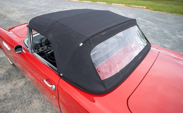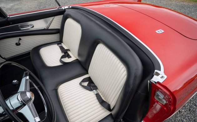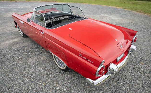 The exterior of this T-Bird looks fantastic with its shiny Torch Red paint, gleaming bumpers and grille, subdued chrome trim, and well-proportioned styling. It’s wearing aftermarket wire wheels and was ordered with the optional rear fender shields, backup lights, and, most importantly, the desirable soft top (that folds and stows away behind the front seat), which was a $290.00 option when ordered with the standard fiberglass removable hardtop. There are no photos, but the seller says the black convertible top is in excellent condition. You’ll notice this ’55 has a white hardtop with porthole windows. Although I’ve read that ’55 Thunderbirds only left the factory with color-matching removable hardtops, customers could have dealers paint them in contrasting colors. Also, porthole windows, added to the 1956 models due to customer visibility complaints, were never offered on ’55 models, but many owners of ’55 Thunderbirds had their non-porthole hardtops converted to the now-iconic porthole windows.