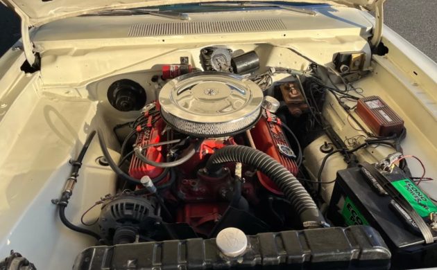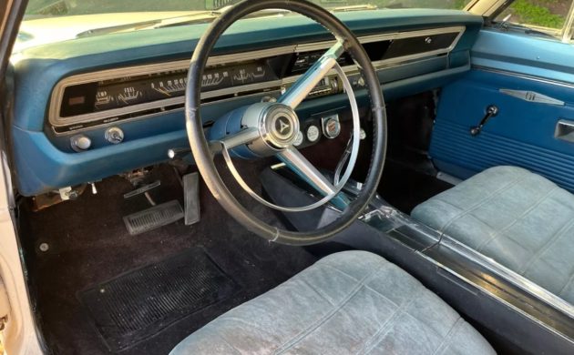 The Dart’s interior is serviceable, but it is one area where the new owner could weave their magic. There are no gaping holes or other major problems, but it simply looks tired and in need of a refresh. The seats wear aftermarket covers that don’t match the rest of the vinyl trim, and the carpet exhibits wear under the driver’s feet. However, the dash, pad, and console are in good order, and the car retains its factory pushbutton radio. The seller added extra gauges below the dash to monitor that sweet V8, although removing them would be child’s play if the buyer preferred authenticity.