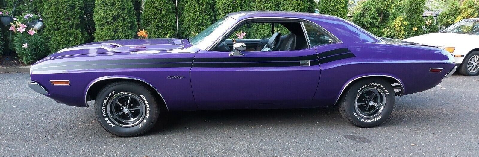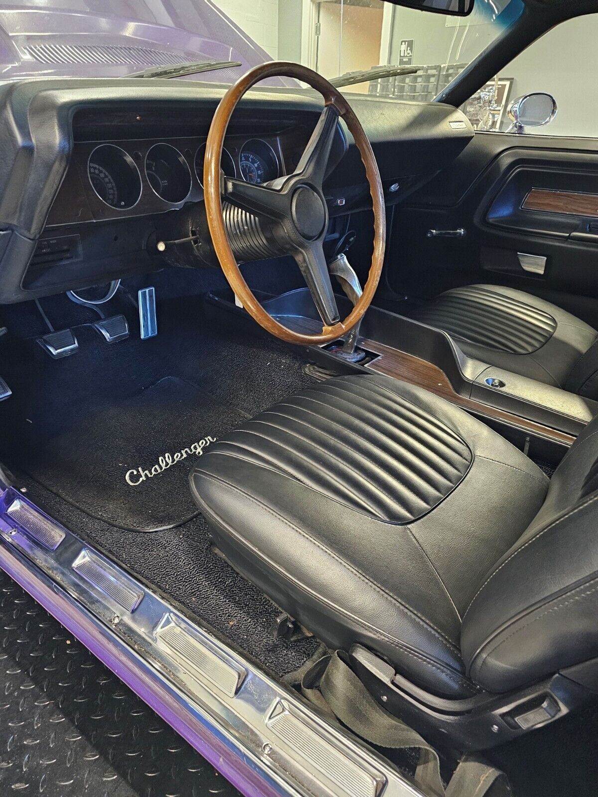 The seller confirms the previous owner purchased this Challenger in 1986. They stripped the panels to bare metal, finding no rust requiring repair. It received three coats of epoxy primer and was sanded before a fresh layer of the original Plum Crazy was applied in a clear-over-base process. They replaced all exterior trim and chrome, and the effort was worthwhile. The Challenger presents exceptionally well for a high-end driver, although the seller admits it isn’t perfect. The panel gaps are tight and consistent, with everything opening and closing effortlessly. The spotless floors and rails wear a uniform layer of Black undercoat to maximize the chances it will remain rust-free. The Black stripes look crisp, the glass is pristine, and the reproduction Road Wheels look perfect.