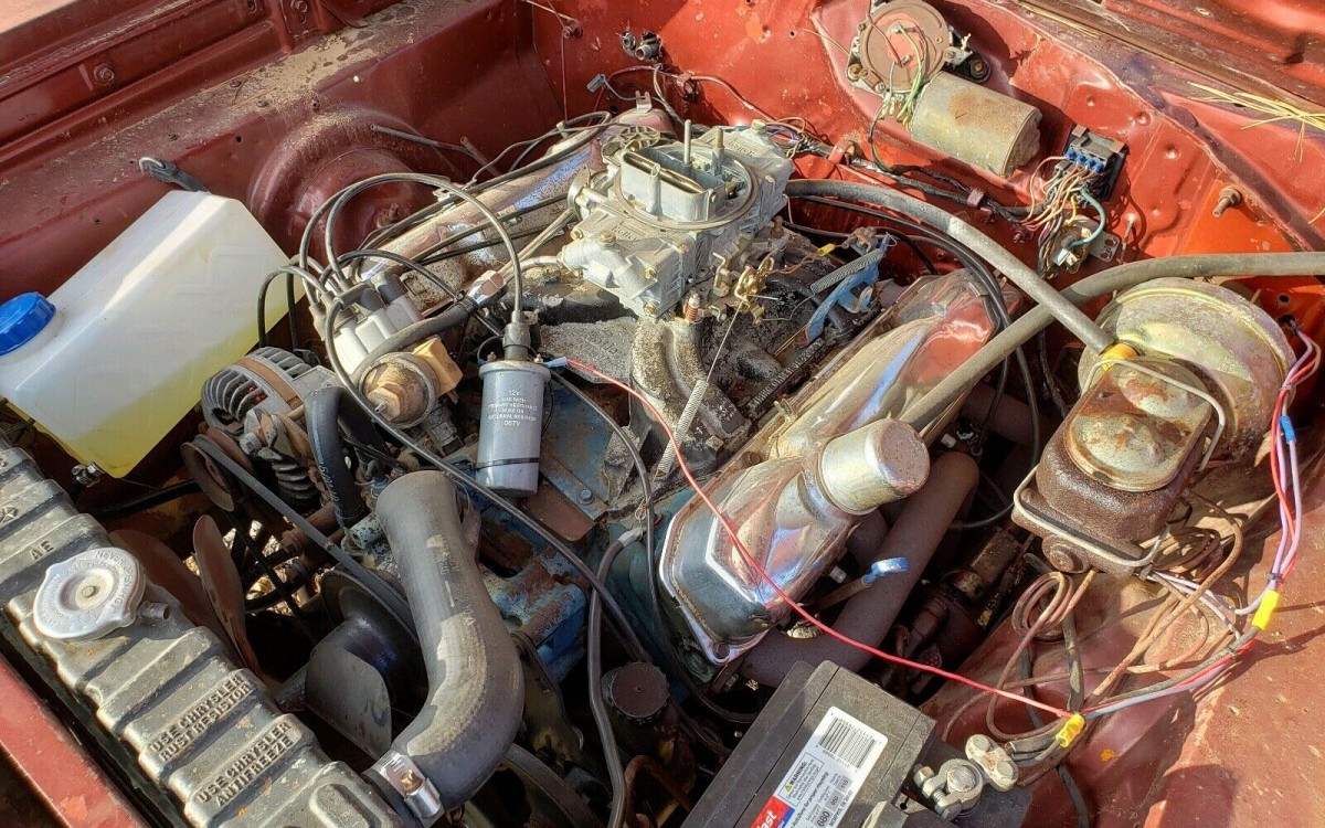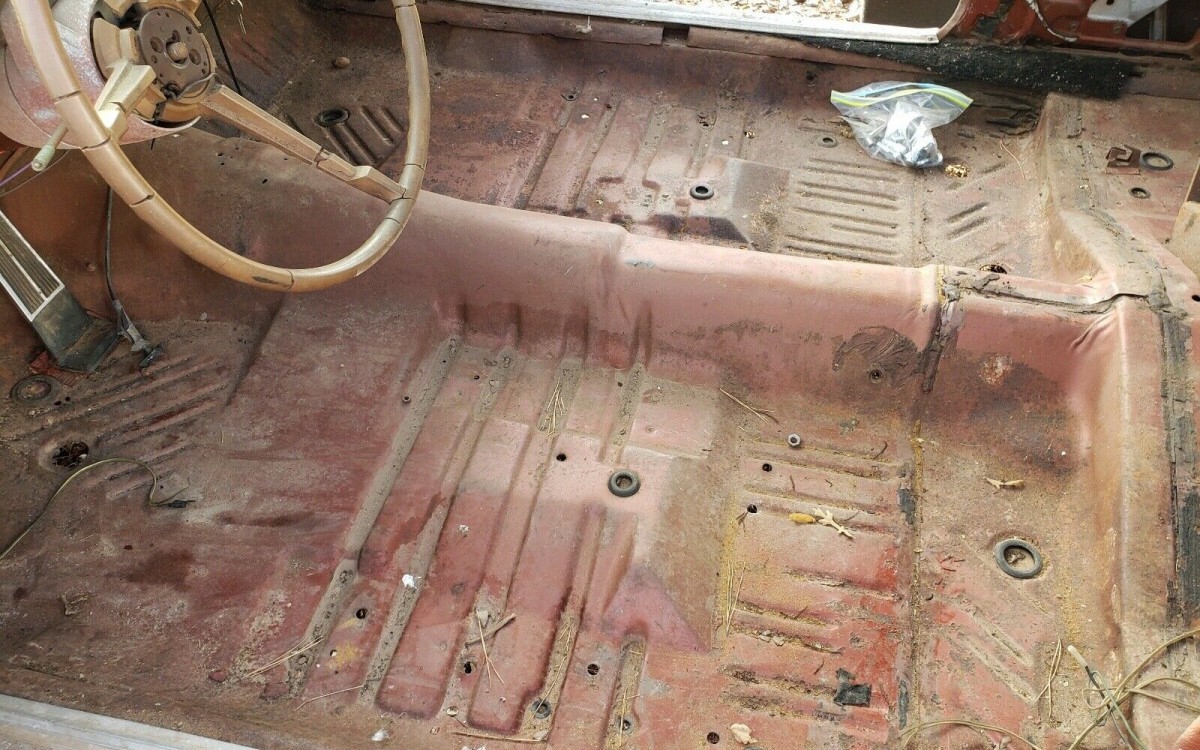 The interior is said to have originally been Burnt Orange as well, but you’d never know it as the majority of the inside has been removed, and what’s left of the dash is going to need a lot of attention. Fortunately, the carpet is also MIA and most of the floor pans are looking solid, except for an area under the pedals which is going to need to be repaired. The interior originally came with a split bench seat and a fold-down armrest. Other equipment included a factory tach, side and hood stripes, power steering, and power brakes.