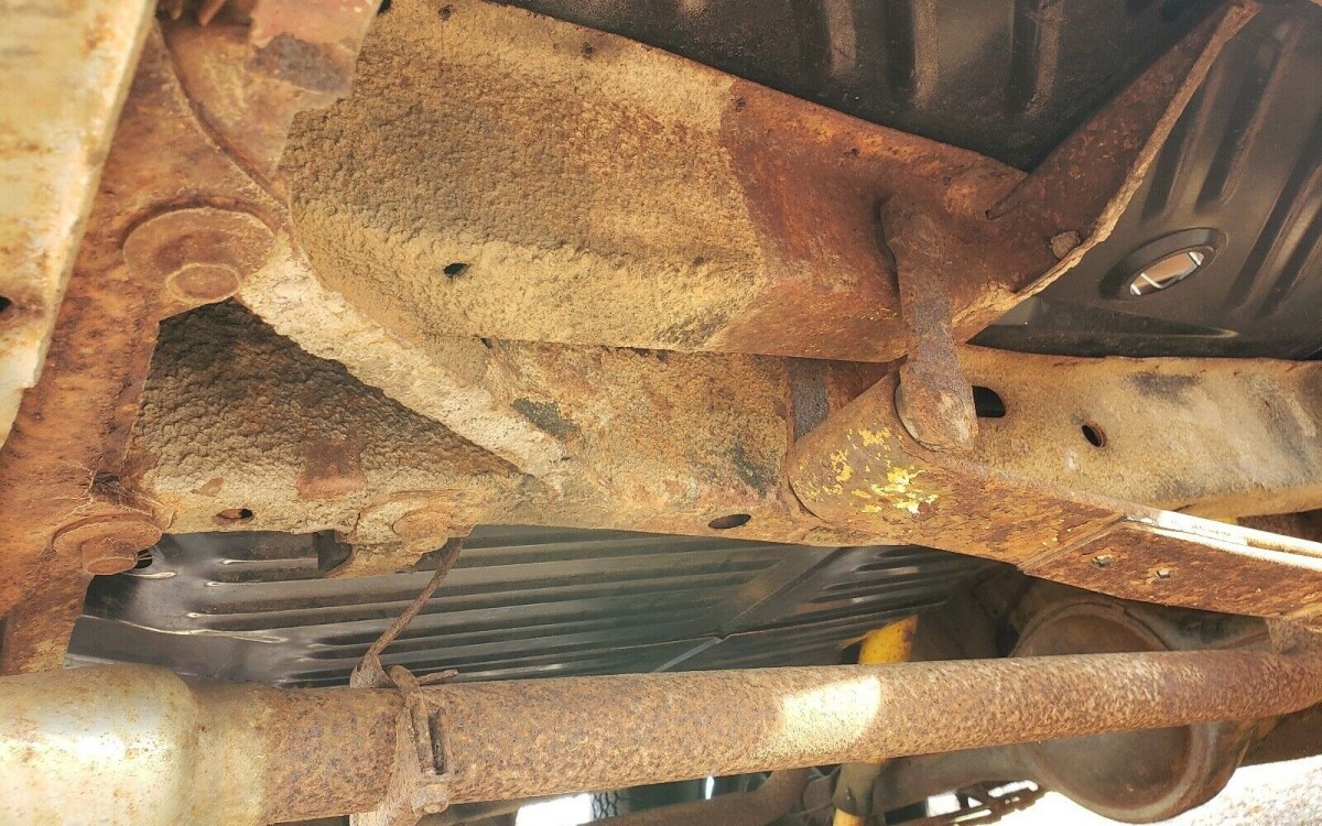 The seller included 3 photos from underneath the car, and while there is some surface rust showing overall the undercarriage is looking pretty solid, with no obvious serious corrosion issues that would immediately cause a major concern. The trunk floor has been removed and a new one installed, but it still needs to be finished up, as do the rear wheel well areas.