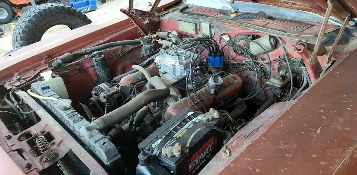 On the plus side, what we can see of the interior looks quite nice, suggesting the car has been out of the sunlight most of its dormancy. The upholstery and door panels look good, although there appears to be a couple of small cracks in the dash pad. It may be the angle of the photo taken, but the steering column looks off-center as I don’t think these cars has a swing-away option like the 1960s Thunderbirds.