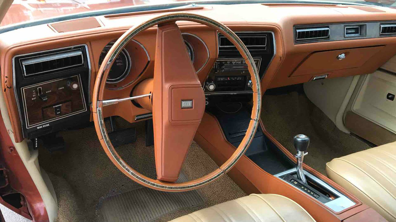 They wouldn’t have made a red car with an orange dash so it’s a factory orange color IMO. No front bumper and grill pics which is where the car is least atrractive. For big bumper cutlasses, the 73-74s salons are nicer. Does this one have front swivel seats?