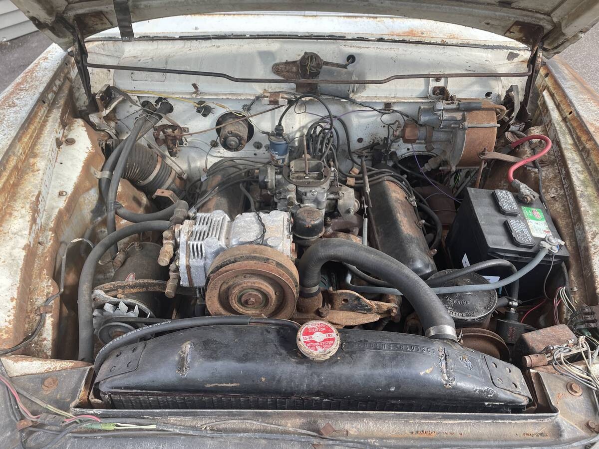 Under the hood is a V-8 engine with the compressor for the previously mentioned aftermarket air conditioner sitting proudly on top. I do not see a belt for the compressor, so one could likely assume that this unit is not currently operational. This does make you wonder if there is a business that specializes in these aftermarket air conditioning units. They aren’t rare, so someone must be able to help owners get these back in shape.