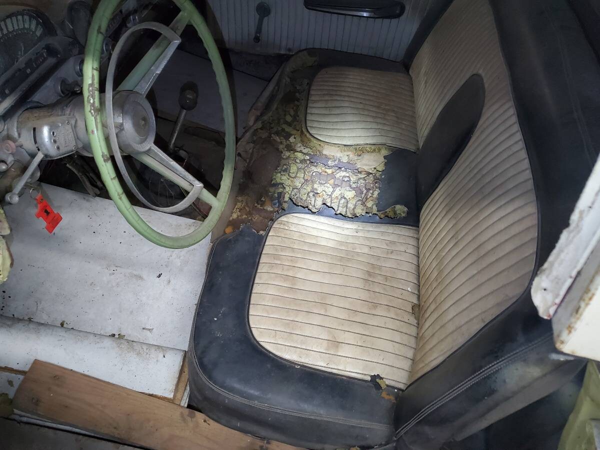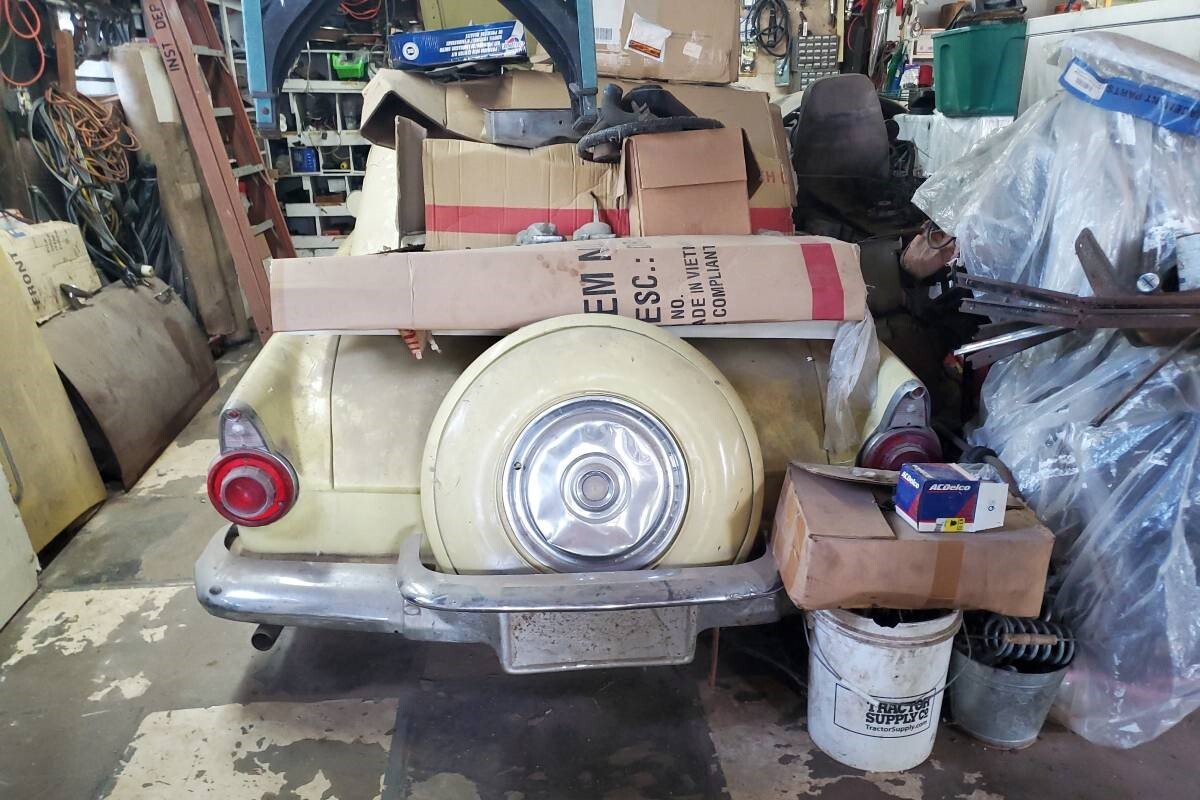 In storage for a decade and a half, this T-Bird has become a shelf for all sorts of things to get piled up on top of. So hopefully that hasn’t done any harm to the body and paint, which have other issues. While the trunk floor is said to be passable, the floorboards in the passenger compartment have already been cut out but just lying in place for now. The car received a change in paint color at some point, from Sage Green to some form of yellow. There is no soft top for the auto and the hardtop that’s there is not the correct one (a ’55 or ’57?).
