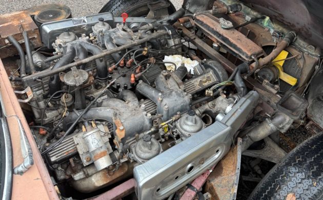 Jaguar utilized three engines during the E-Type’s production life. Initially featuring a 3.8-liter DOHC six, the motor’s capacity grew to 4.2-liters in 1964. It pushed the boat out in 1971, adopting the 5.3-liter V12 in the refreshed Series III. This car features the V12, teamed with the desirable four-speed manual transmission. That year’s Sales Brochure quotes power and torque figures of 241hp and 285 ft/lbs, and while the E-Type wasn’t as fast as it had been previously, it was still a pretty handy weapon with excellent handling and braking. The seller confirms that this Jag is numbers-matching and provides no information on the mechanical condition. If the V12 turns freely, revival may be straightforward. However, bracing for the cost of a rebuild would be a smart strategy.