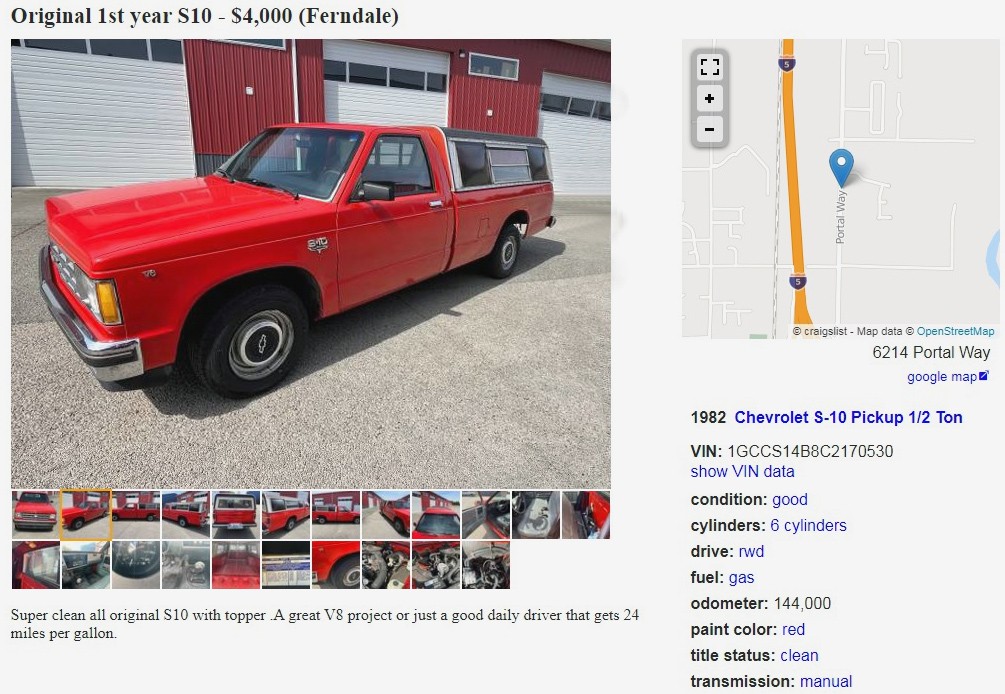 What a great-looking truck! It isn’t perfect, but this Cinnamon Red, first-year 1982 Chevrolet S-10 long-bed (7′-6″) truck with a topper, or cap, on it looks fantastic. Not to mention, it’s equipped with a V6 engine and a four-speed manual transmission. The seller has it posted here on craigslist in Ferndale, Washington, and they’re asking $4,000. Here is the original listing, and thanks to Curvette for the tip!