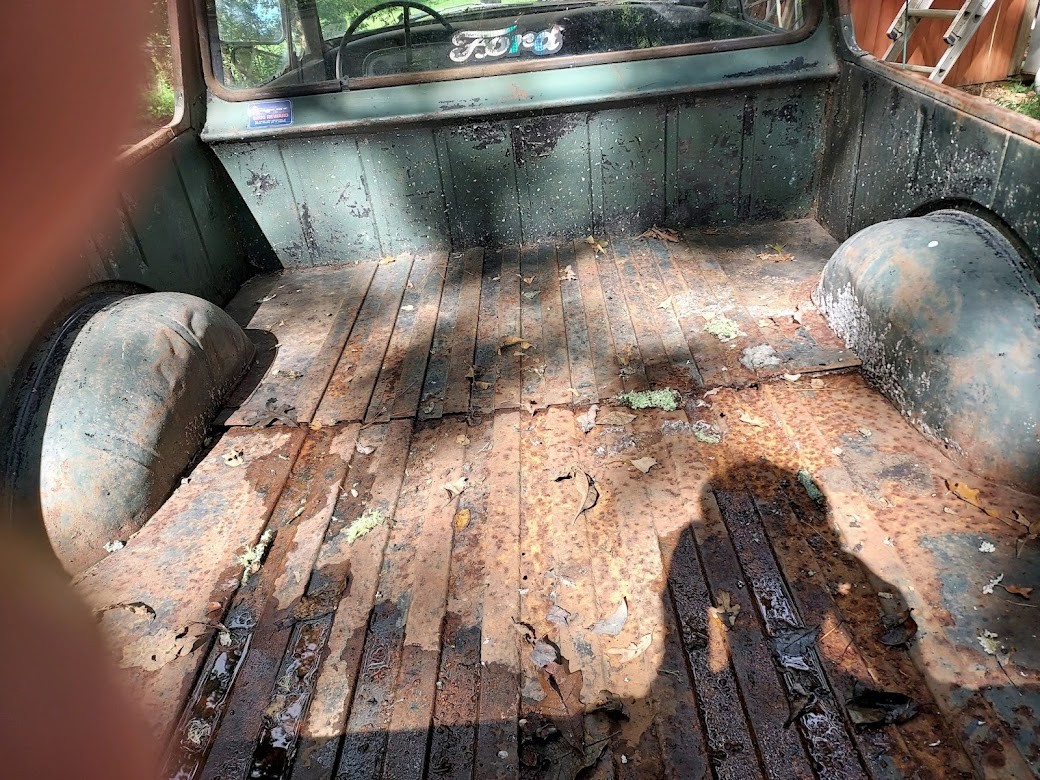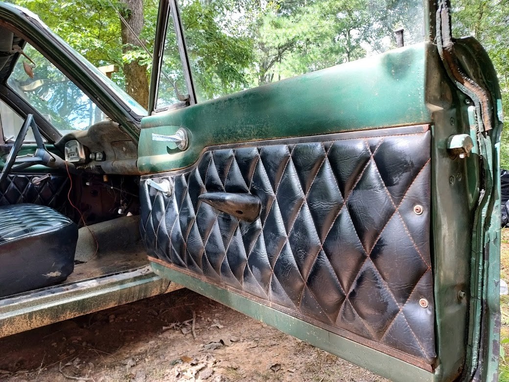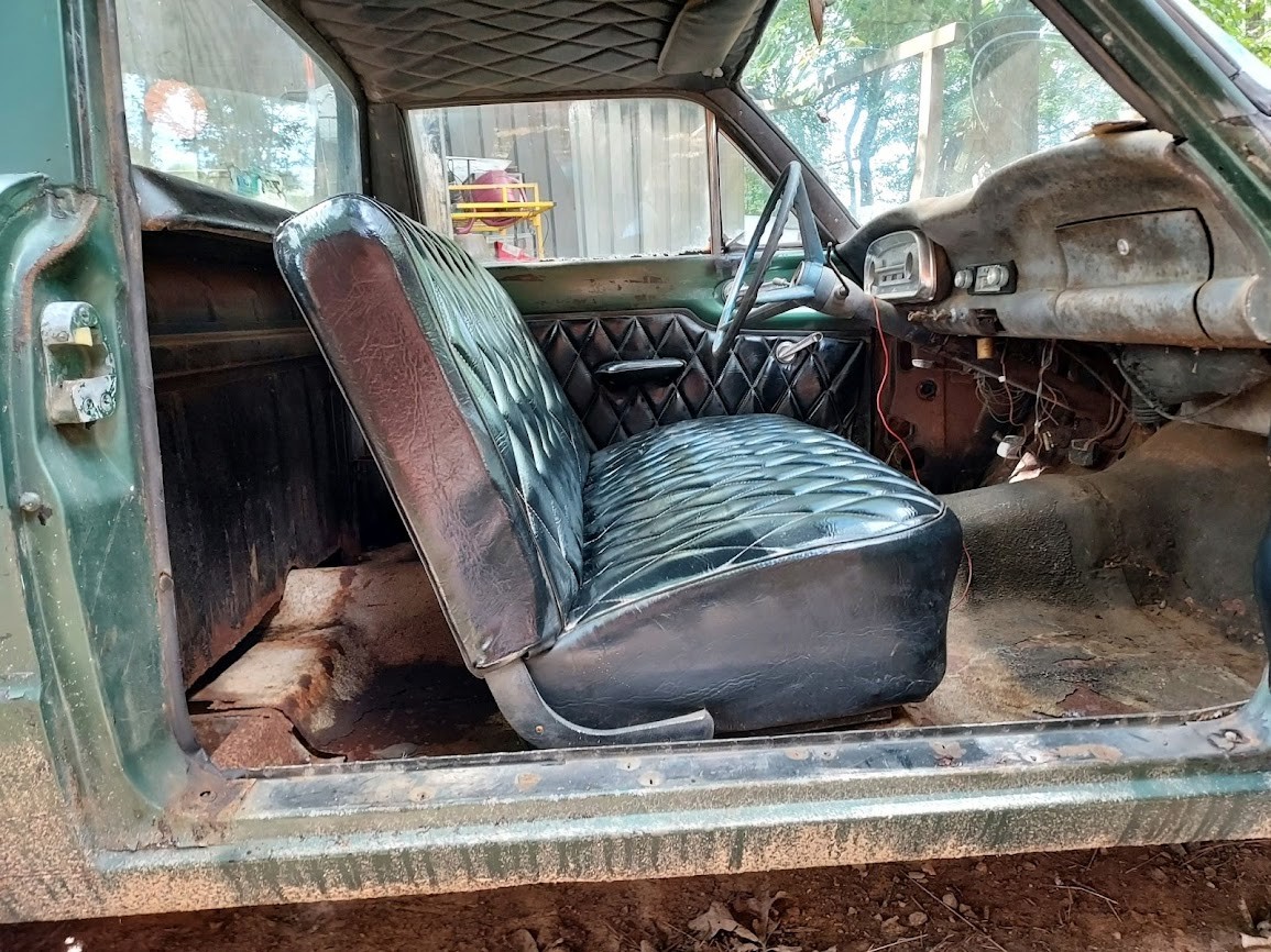 The diamond tuck interior is pretty wild and looks to be very well done. It covers the door panels, seats, and headliner, and remains in very good condition. We are not sure how the truck was used in the past, but it’s been on the property for ages. The Ranchero was parked in an open-air shed, so it was protected from the elements, and the interior is testament to the doors sealing tightly and keeping any moisture out. The floors are solid and we don’t see much in the way of rust aside from the aforementioned tailgate. The shifter moves freely and the clutch engages fine. Obviously, all fluids should be changed and the car given a proper going over, but it stops and steers without issue.