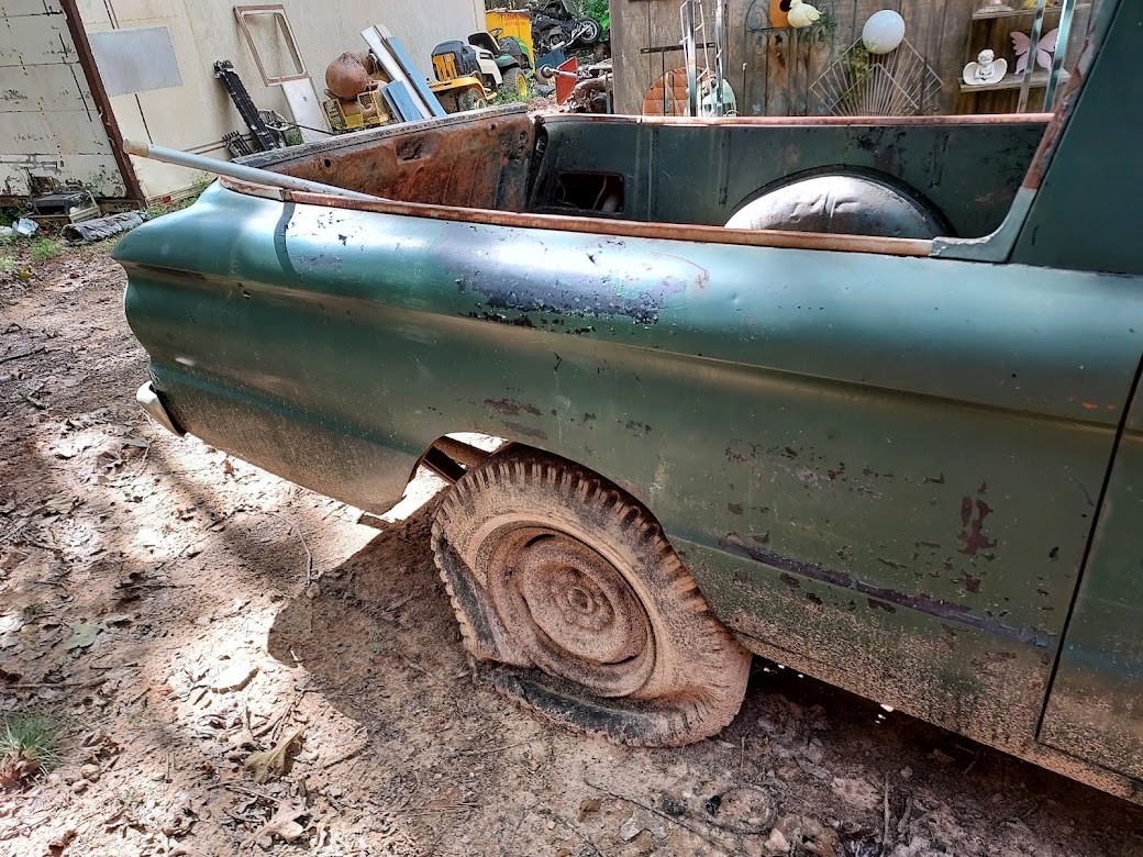 I’ve asked the owner a few times to get it out after I realized how sound the body was, and I loved the colors, too – it’s sort of like a Bullitt-style of forest green, and I’d love to see it on some dark gray torque thrust wheels. The body is pretty solid, aside from some rough patches here and there. The tailgate is the worst of it, and I’d likely look for a new one if it were my project. We do have a few of these as parts trucks on the property, so there are some options if you want to grab a replacement gate. The front wheel arches appear to have been flared slightly, as if to make way for larger wheels at one time, but the steel wheels on it now seem like the standard size. The grill is in excellent condition, along with most of the trim.