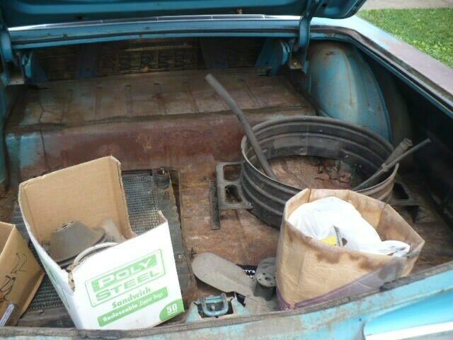 The surviving blue paint has the requisite patina for possibly being 61 years old. We’re told the frame, front floors, doors, and trunk lid are good. The rear floor has one rust hole and the trunk a few more. The rocker panels may be good although one of them is dented. Both quarter panels and front fenders have a crust along the bottoms as does the hood. The seller says the interior is complete but will need redoing, although only one photo of that area is provided. The assumption is the glass is all there and the side windows are simply rolled down.