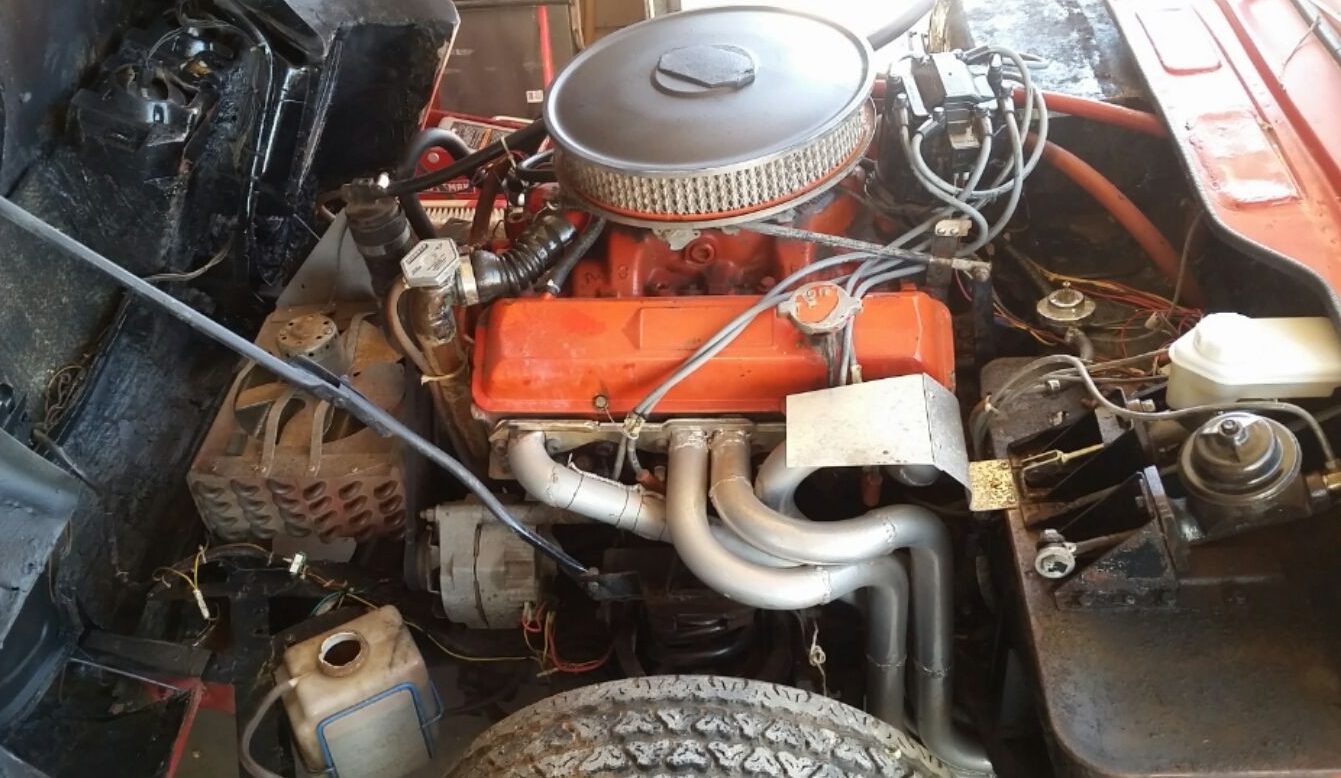 Here’s the Chevy 327. It runs but needs a little starting fluid to get it going sometimes. The electric fuel pump is noisy, but when the engine starts you can’t hear it or anything anymore anyway. The thing in front of the engine looks like the coil and fan from a refrigeration unit so perhaps this thing has AC. The radiator is in the trunk.