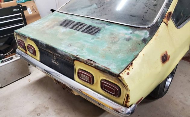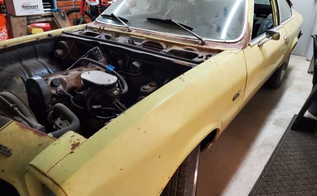 The once-troublesome Vega inline-4 is long gone, replaced by a 350 cubic inch V8 paired with a TH-350 automatic transmission. Whatever work was needed, the seller says the effort is three-quarters complete. You can tell this Vega apart from the other because it has no black stripes. No mention is made of whether this Chevrolet runs. The rust, which was typical of the Vega, is almost non-existent here.