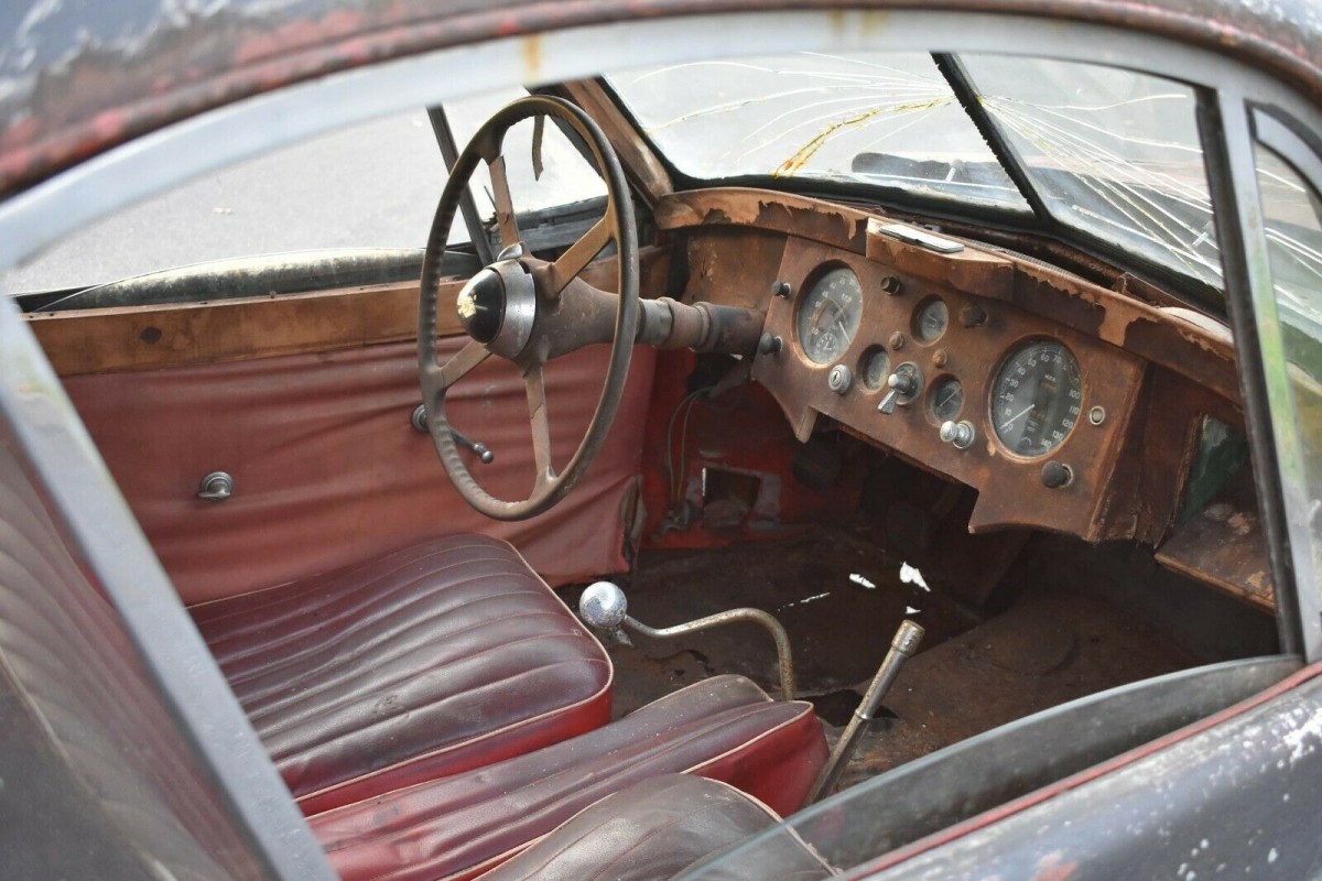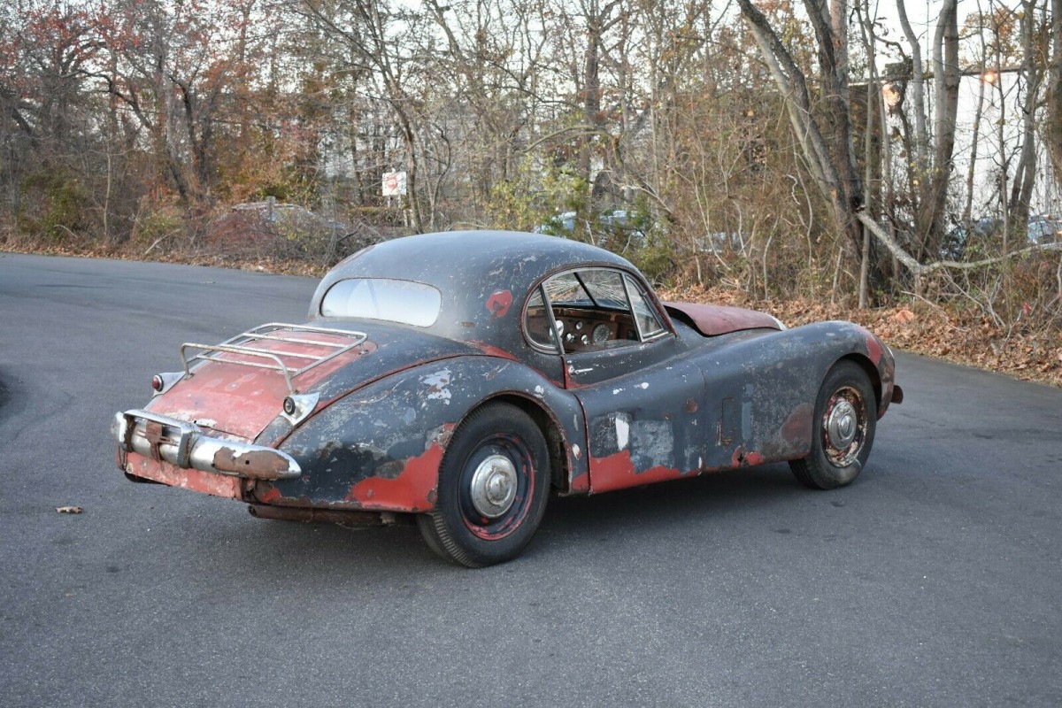 This 1953 Jaguar XK120 fixed-head coupe is a barn find from Alabama that features some unusual modifications. The engine has been swapped out for a Chevy small-block V8 and a four-speed manual, and the nose has been fitted with genuine Porsche 356 headlights from OEM manufacturer Hella. The result is a curious combination of styles that almost gives it a Bugatti-vibe. Find this custom Jaguar here on eBay with bidding at $7,500 and the reserve unmet.