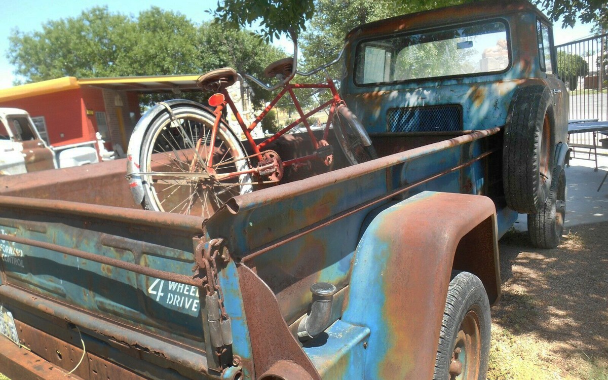 I’m not sure if carrying around a tandem bicycle will do much to pivot that center of gravity towards the rear, but it does show how long the FC-170 bed is. You can see a little rust on the tailgate but this looks like a solid truck. A few years ago I had a wild idea: what if a Jeep FC had a cab like a regular pickup… (insert dream sequence here)…