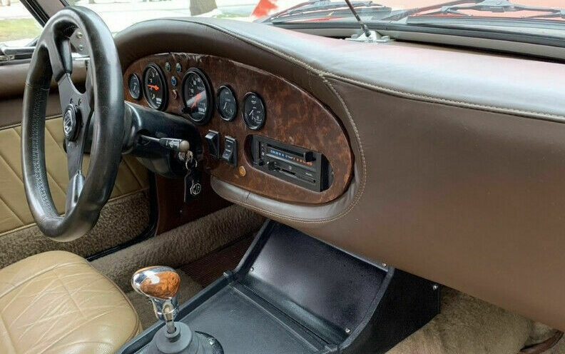 The interior I pretty fair though the dashboard/instrument panel looks a bit thrown together. The seating surfaces are trimmed in leather and there is a matching carpet in place, it all pulls together nicely. The seller mentions that the instrument panel gauges all work and a newer AutoMeter tachometer has been installed. Note the steering wheel, it’s a nice Dino leather-wrapped piece but it maintains an “MG” horn button.