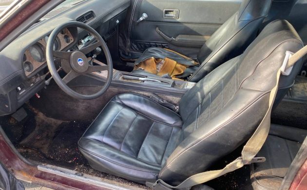 The problem areas lie with the body (rusted out rear quarter panel) and a rattle-can paint job (satin black covering the original burgundy). The interior needs loads of help (upholstery, carpeting, headliner). But we’re told it runs well. Maybe your best bet is to drive it as-is until it won’t go anymore, as all the cosmetic needs probably outweigh its future resale value.