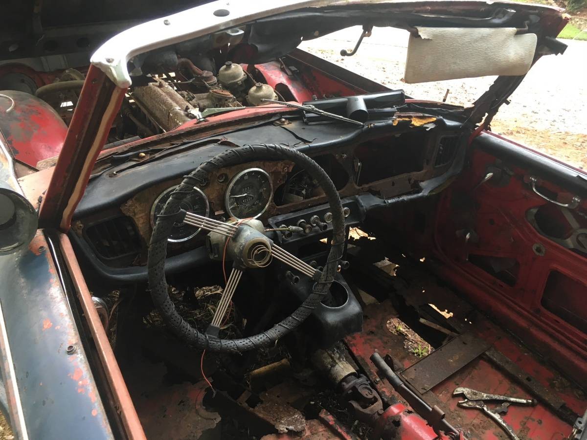 That said, the TR4 does come with a seemingly complete motor and some of its interior. The chrome bumpers are tired but possibly re-usable. The interior looks to be a pile of foam pads at this point, stuffed into the trunk, and the missing windshield and top are hastening the floor’s demise. The seller suggests the large engine bay could accept a V8 swap, but not until you restore the structural integrity first. Parts car or ambitious restore – you decide!