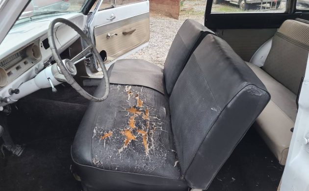 The seller of this Falcon raises the idea of an engine swap, primarily because the engine that’s currently taking up space in the engine compartment is missing a distributor, carburetor, and radiator. On the other hand, a Ford inline-six is a tough engine, and as long as it rotates, the cheapest option would be to get this one running and throw in an aftermarket Mustang radiator. The standard engine in 1964 Falcon Wagons was the 170, but this is clearly a later model (maybe Ford six experts can narrow it down). On an unrelated note, did you know that the 144 was still available in Falcon sedans in 1964? That would have been painfully slow.