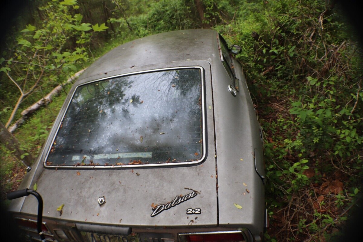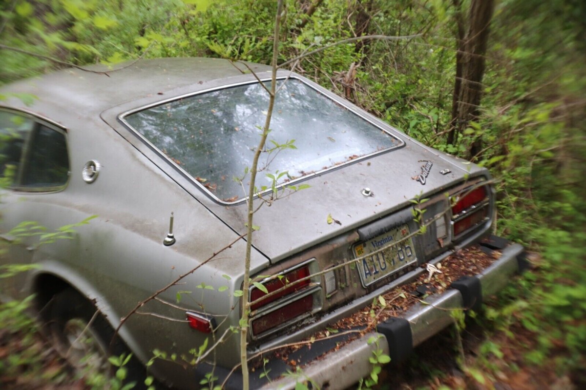 The least popular model of a 45 year old car, buried to the axles in the woods.