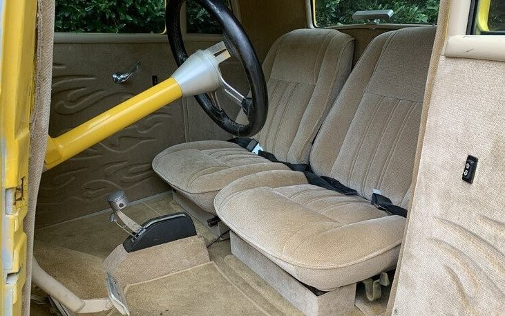 The interior is listed as being in “great shape” and it looks it though there’s a whole lot of tan velour-type fabric going on – seats, upholstery panels, carpet, mats, and headliner. The instrument panel has been redone with digital gauges, it’s a very custom environment and probably looks nothing remotely like it did originally. Agreed, it is all in really great shape!