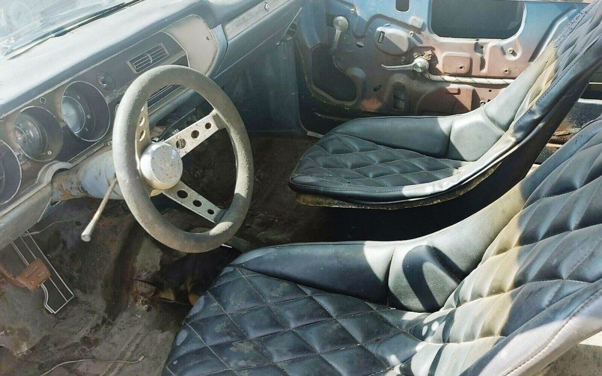 The original four-speed manual gearbox and air conditioning are long gone, replaced by an automatic and open windows. Fiberglass dune buggy seats and a department store steering wheel complete the super-’70s vibe. The manual shift brake pedal remains.