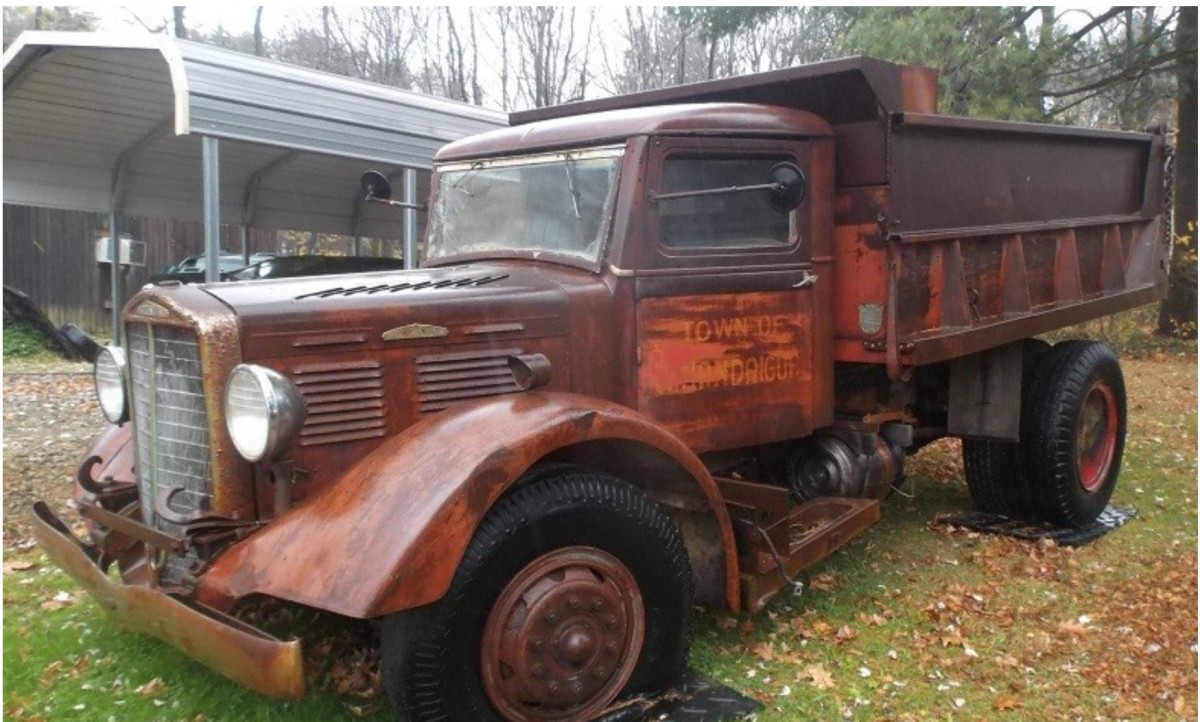Brockway, always identified by it’s signature windshield design, was primarily an east coast make. It was more than a “Mack on steroids”. They had many features Mack didn’t have, like “Husky-Drive”, a type of transmission setup. Mack used Bulldogs, and Brockway used the Alaskan Husky, to promote toughness. We never saw’r a Brockway in the MIdwest, and I would notice such things. Year shouldn’t be a big deal, I read, during the onset of Dubja, Dubja 2, der, manufacturers were making trucks so fast, serial numbers did get messed up. Most of these were blown to smithereens anyway,( hopefully the driver got out) or remained in Europe after the war. The ones that didn’t go overseas, usually ended up as municipal trucks. Too bad there’s no interior shots, Brockway always had a nice dash and 4 spoke steering wheel. To be clear, diesels were a ways off for this model, most all were gas jobs until Mack took them on in the 50’s. Out east, Brockway was a household name, I bet some in other parts never heard of them. Great find, stuff like this has almost all but been found. About 20 years ago, I read an article in some magazine, someone in upstate NY came across an abandoned gravel pit, from the 40’s, with a bunch of dump trucks from the 30’s all over grown. They figured, someone who owned the gravel pit, went to war, and never came back. Adam is right, info on Brockway’s, or most vintage trucks is limited. This probably has a crash box 5 speed, maybe a 2 speed rear, but I doubt it, there was no need for a 2 speed in the 40’s and certainly needs updating from the gearbox back, the motor is fine, but is a low rpm engine, with torque under 3,000, so gearing for today, is a must. If you have the slightest hankering for an old dump truck, I wouldn’t dawdle on this one. Redo it as you see fit, but there just can’t be many left like this. Great find, and only on BarnFinds!!!