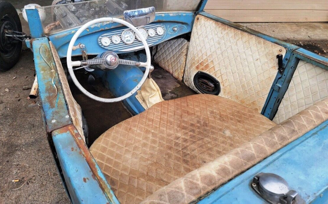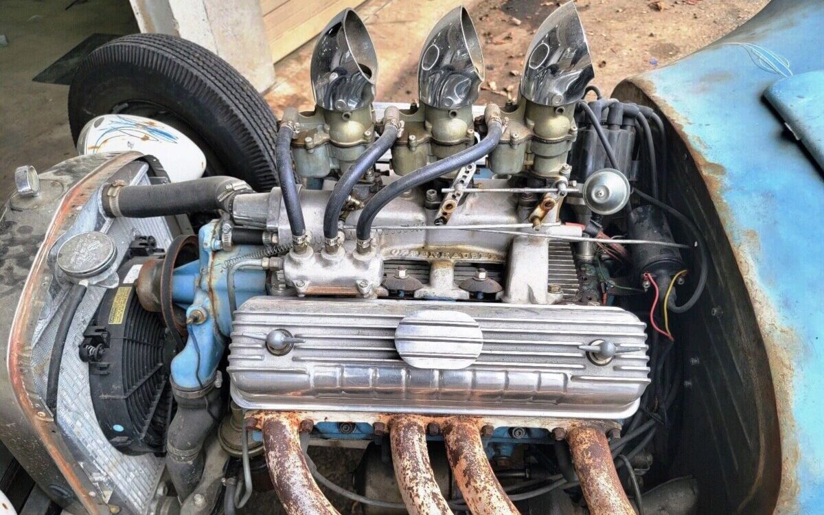 Anyone complaining about a small block Chevy V8 in a Ford can stand down. Despite the similar-looking exhaust port arrangement, this is no SBC! The 1957 Ford “Y Block” 292 cid (4.8L) V8 spins a later five-speed T5 manual transmission. A bazillion Mustangs used that gearbox, including my 1989 Mustang LX 5.0. Triple two-barrels on an Offenhauser intake and finned valve covers accentuate the throw-back style. The electric fan… not so much, but you’ll forgive that the first time you’re stuck in August traffic.
