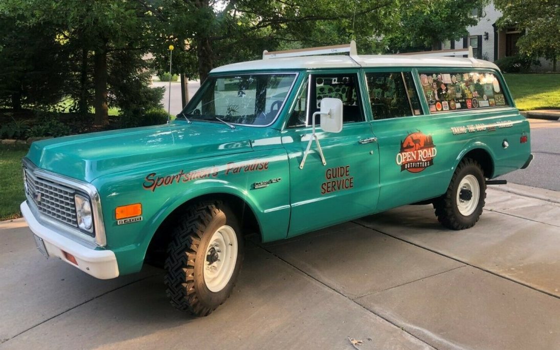 I’ll admit it. I’m a sucker for vintage camping/hunting/fishing vehicles. When I see an old Woody or Suburban decked out with “XYZ Lodge” on the side and vintage gear loaded up, it makes me want to travel back in time and enjoy the freedom of lake living. Such is the case with this 1972 Chevrolet 3-door Suburban. It looks like it drove straight out of the woods of 1972 into 2020. It can be found here on eBay with an asking price of $36,500. I would expect a truck like this to be located in Maine, Minnesota, or Idaho, but it currently resides in Wichita, Kansas. Have a closer look at this time capsule and check out the vintage accessories that come with it!