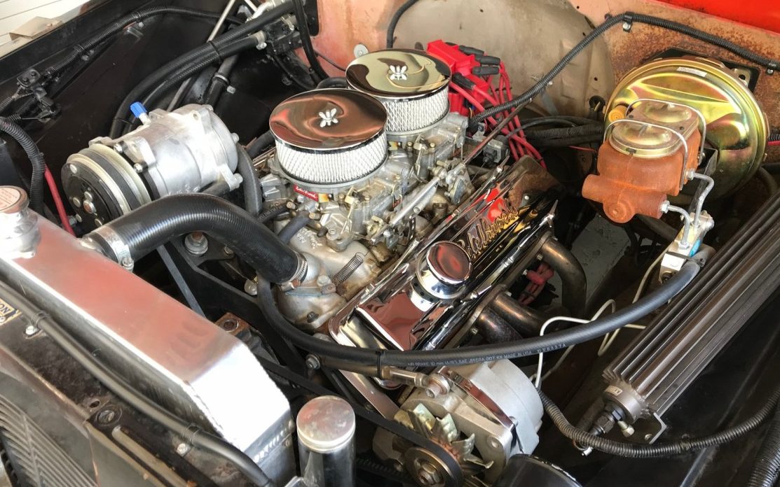 The engine definitely has a performance look. A reliable small-block 350 is the power plant of choice. It has been topped with dual four bbl carburetors and exhaust exits through dual mufflers through the bedside in front of the rear tires. The engine also has a mild camshaft along with AC. For those hot desert race days, there’s an aluminum radiator and the hood features over a hundred louvers to keep it running cool.
