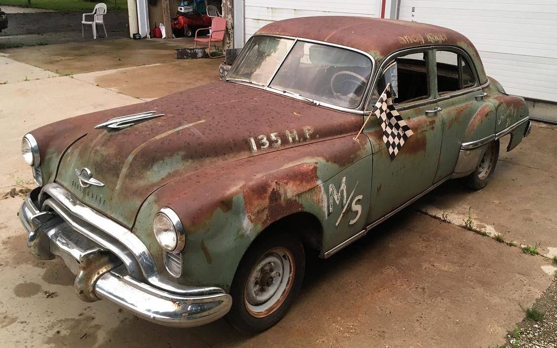 It’s not every day you can buy a car with racing history for under $3000 that doesn’t appear to have been barrel-rolled or abandoned outdoors so long that it’s nearly rusted into something that resembles a giant bowl of brown corn-flakes. This 1949 Oldsmobile Rocket 88 Sedan in Milwaukee, Wisconsin seeks a new owner here on hemmings.com with a seemingly reasonable $2700 price tag. Thanks to reader Tristan C. who suggested we feature this slice of automotive history. Our Australian friends may appreciate the four-door body on this racer. Too often Americans see a coupe as a “classic,” while an otherwise similar four-door is simply a “used car.”