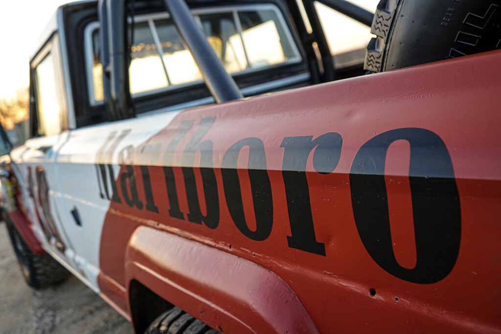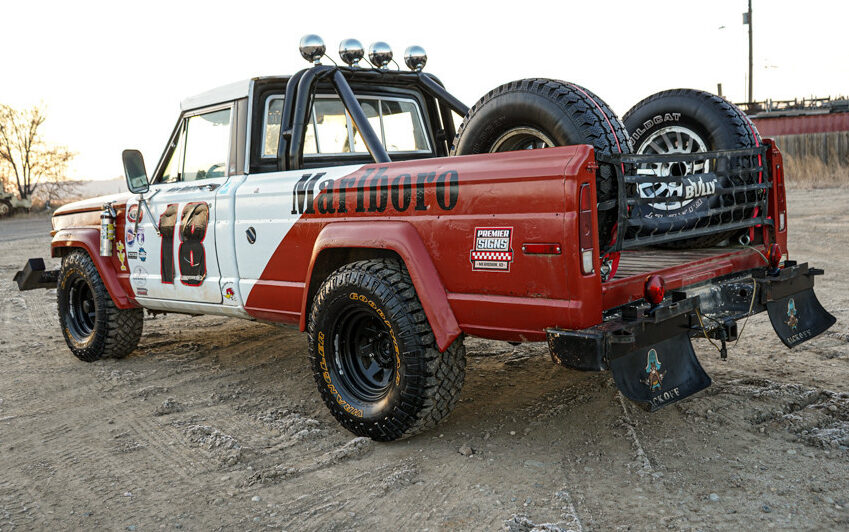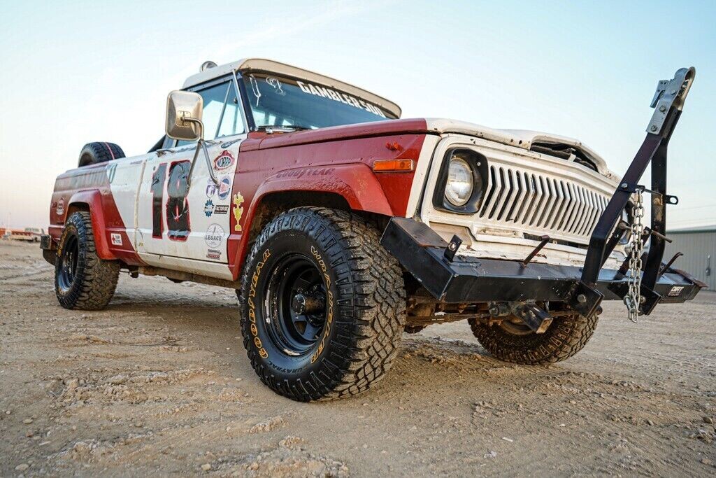 Vintage racing Jeeps aren’t around every corner, making this listing pretty unusual. Here on eBay is a 1976 Jeep J10 said to be a Baja racer, bid to $2,025 with no reserve. The vehicle is located in Caldwell, Idaho, and this tip came to us courtesy of T.J. The seller’s ad is unfortunately short of details, so we’ll have to fill in the blanks as best as we can. We do know the Jeep J10 started out under the Gladiator name, a vehicle that was produced from 1962 through 1988 in one form or another. By the time this Jeep was made, the two-wheel drive option had given way to the much more popular four-wheel drive. The paint scheme indicates Marlboro as a sponsor; the driver’s name is Mike Honcho and the co-driver is Gator McKlusky. Mike Honcho was the Playgirl-posing alias of the Cal McNaughton Jr character in Talledega Nights. Burt Reynolds played the Gator McKlusky character in White Lightening, a movie produced in 1973, but the movie car was a Ford Galaxie, not a Jeep. The truck is set up to tow behind your race trailer.