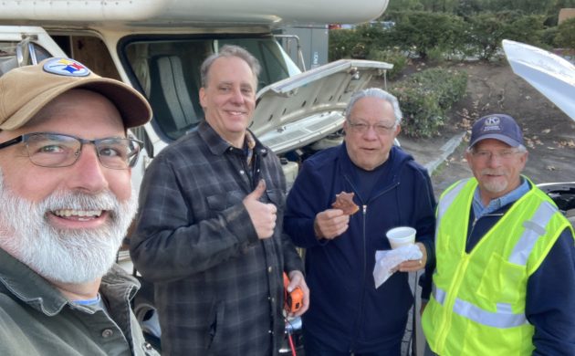 This picture shows Adam and myself with the two gentlemen who jumped the Lazy Daze to start Day Two. Thanks, fellas! Day One we flew into San Diego, inked the title, then snatched pre-ordered supplies at Wal-mart and Harbor Freight in San Marcos before escaping the city late, hitting a hotel due to the near-freezing lows. The hotel also postponed the unsavory epitaph, “perished in a horrible explosion after drifting off to sleep warmed by an untested 40 year-old propane furnace.”