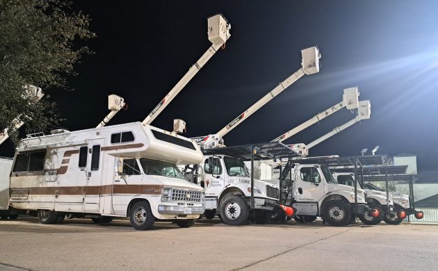 One of these things is not like the others! We nestled in with a squadron of bucket trucks on their way to help with storm recovery.