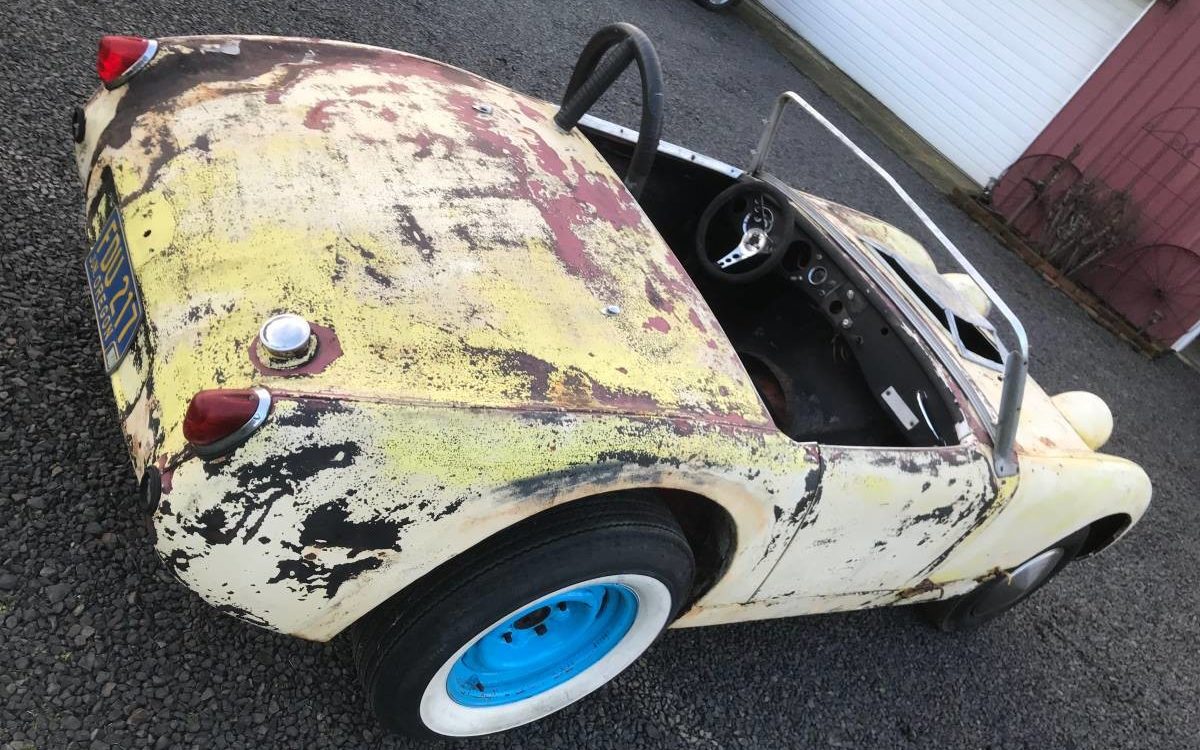 In drag racing, the power-to-weight ratio is the key and as long as you can get your tires to hook up, you generally want the most horsepower in the lightest package. Well, cars don’t get much lighter than a Sprite, so that’s a good start. Unfortunately, the 1960 Sprite would have come from the factory with a 948cc A-series overhead-valve engine mated to a manual transmission, which doesn’t make for a good drag racing setup. How about a big American V8? The engine compartment is set up for a small-block Chevy! You can see the bell housing is still in the car and the seller says it is from a mid-50s Chevrolet so that’s probably the vintage of the engine it used to have. Unfortunately, the engine is gone, but that gives the new owner a blank slate. It is currently set up for a SBC, so that would probably be the way to go.