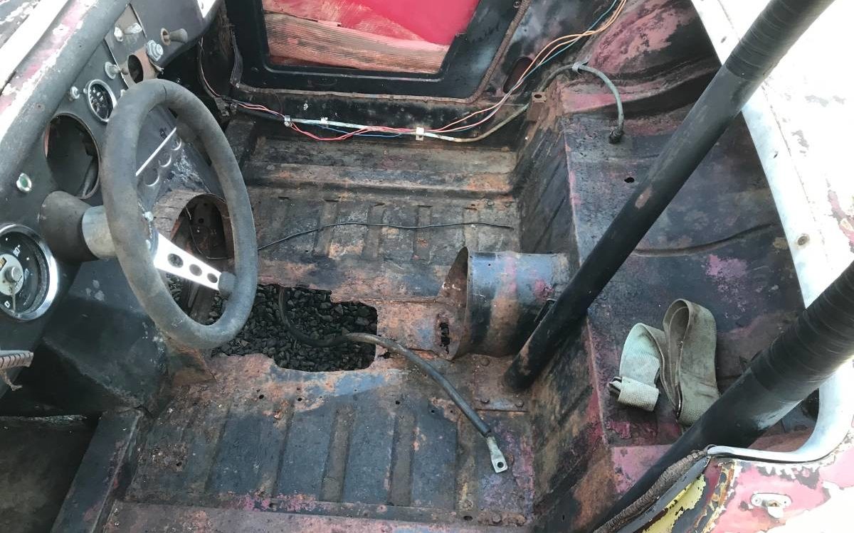 If you were asked to imagine the stripped interior of a vintage drag racer, you’d probably see the image above. Looking closely you can see the modified driveshaft tunnel, remnants of a racing harness, and classic undersized three-spoke steering wheel. The battery cable likely means the battery was relocated to the trunk for weight distribution and/or to make room under the hood.