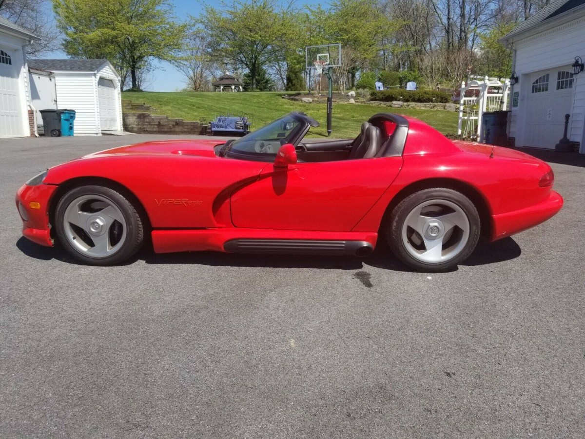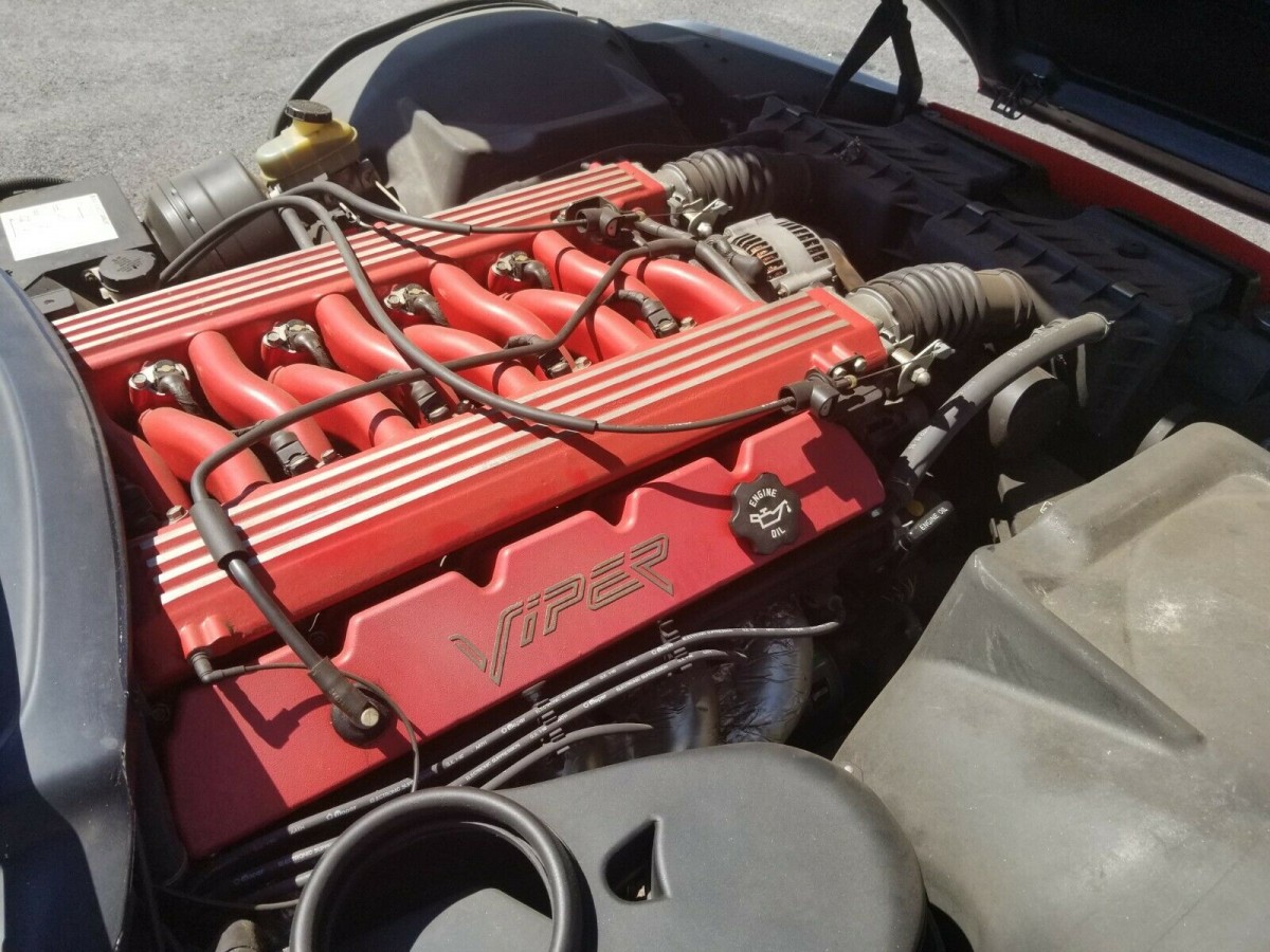 The 8.0 liter engine looks impressive under the long hood. Dodge rated the engine at 400 horsepower and 630 lb ft of torque from the factory. In town, the EPA rated the fuel inefficiency at 12 mpg and on the highway the Viper was said to achieve 20 mpg. Car magazines at the time were able to get from 0 to 60 in about 4.0 to 4.5 seconds and cover the quarter mile in 12.6 seconds. The first generation of the Viper was built from 1992 to 1995 not including the preproduction Vipers in 1991. This car comes with the original canvas top and zip up side windows.
