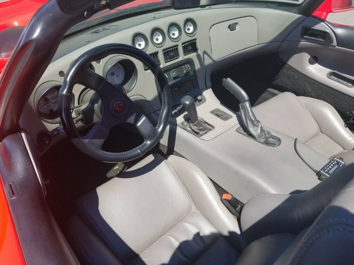 The interior on these early Vipers was sparse but practical. This one looks to be in great shape. From the gray bucket seats to the carpet, everything looks practically new. The car is said to have 31,900 miles on the odometer. As explained in the eBay ad, the first 100 cars were assembled and disassembled 3 times to adjust the production line. Unfortunately, while driving this one day about 15 years ago, a the driver ran over a chunk of a truck tire in the road and it dented the side exhaust on the passenger side. It also damaged the finish on the right front wheel. When the wheel was refinished, it looked fine but now 15 years later, the clear coast is starting to yellow so it doesn’t match the other wheels. The dent in the side exhaust can be clearly seen in the pictures included in the ad.