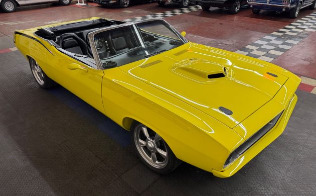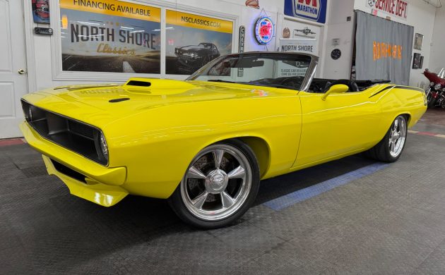 Plymouth introduced its E-Body Barracuda range in 1970, and the car’s styling received widespread acclaim. It looked bold and purposeful, and even the humblest examples seemed to mean business. This first-year Convertible makes a bold visual statement, with its panels cloaked in Top Banana, one of the company’s most striking high-impact paint colors. Criticizing its presentation is seemingly impossible. The paint shines like a new penny, the panels are laser-straight, and the underside shots confirm the car’s rust-free status. The Black power top fits tightly, and the glass is clear. The wheels and rear-quarter decals confirm that this Plymouth is genuinely special, an impression reinforced when the driver presses the button to deploy the custom power hood.