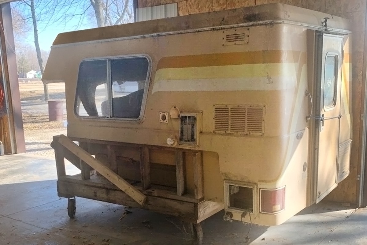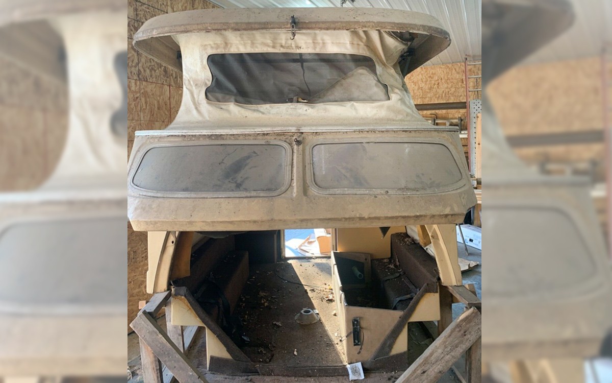 Sadly, that’s what the seller thought when they bought this two decades ago as a complete Blazer Chalet. The Blazer went to the graveyard – it was too far gone to save – and then they built this cool, custom dolly for it and it’s been rocking and rolling around in their shop building ever since. At least it’s been inside, but in the photo above, if you can make out anything in that photo, you can see that it needs mucho work inside.