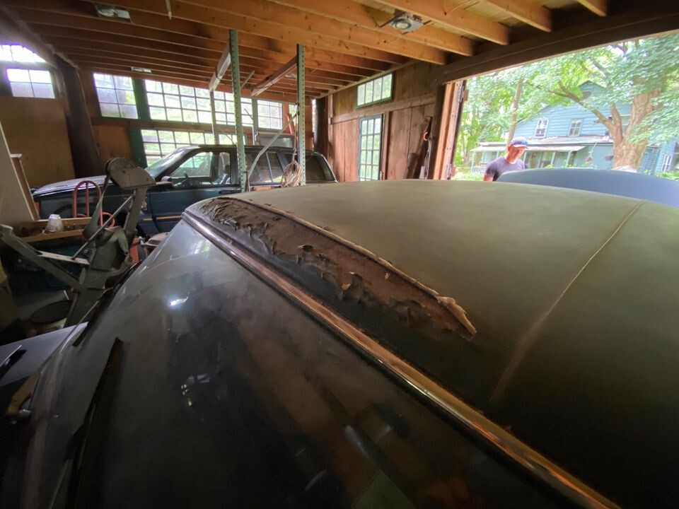 The other problem besides the huge amount of work needed to get it running and driving, is the vinyl roof damage. These cars use a very special vinyl roof material known as “Everflex”. It is designed to be a far more stretchy material. This ability to stretch is important because the roof assembly does not have the typical edge gutters like other cars, where the vinyl top materials edges are hidden in the edge gutters.